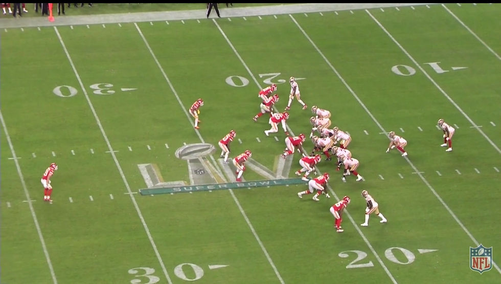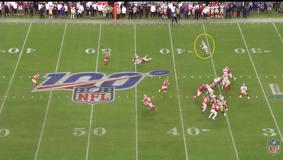 El segundo down resultó ser la otra jugada clave en nuestro ataque del partido. Pase rápido a Kittle que bloquea Chris Jones en la línea. En este caso es Deebo Samuel el que está abierto en el chekdown para Jimmy, sin embargo, no culpo a Garoppolo de buscar a Kittle en un emparejamiento como el que se jugó. Cuando lanza el pase el defensor está de espaldas y vencido, y el Tight End se encuentra en primer down y con unas cuantas yardas por delante. En mi opinión, grandísima jugada de Jones.